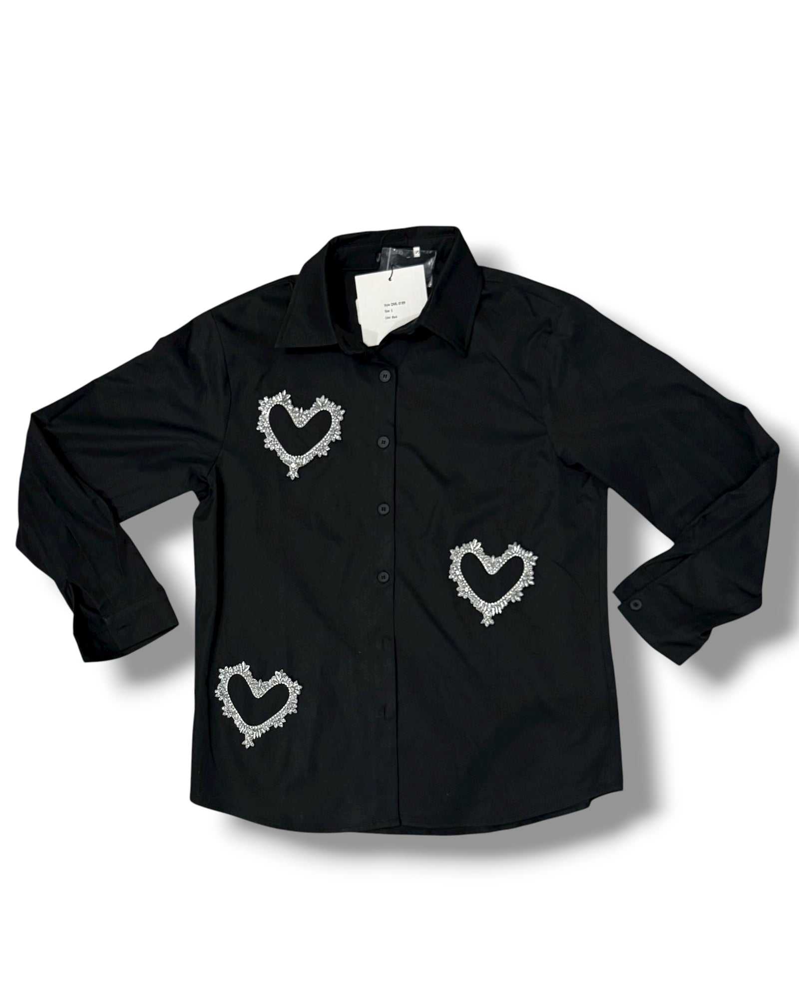 - *Diseño*: Camisa clásica de botones con detalle de corazones brillantes en pedrería.