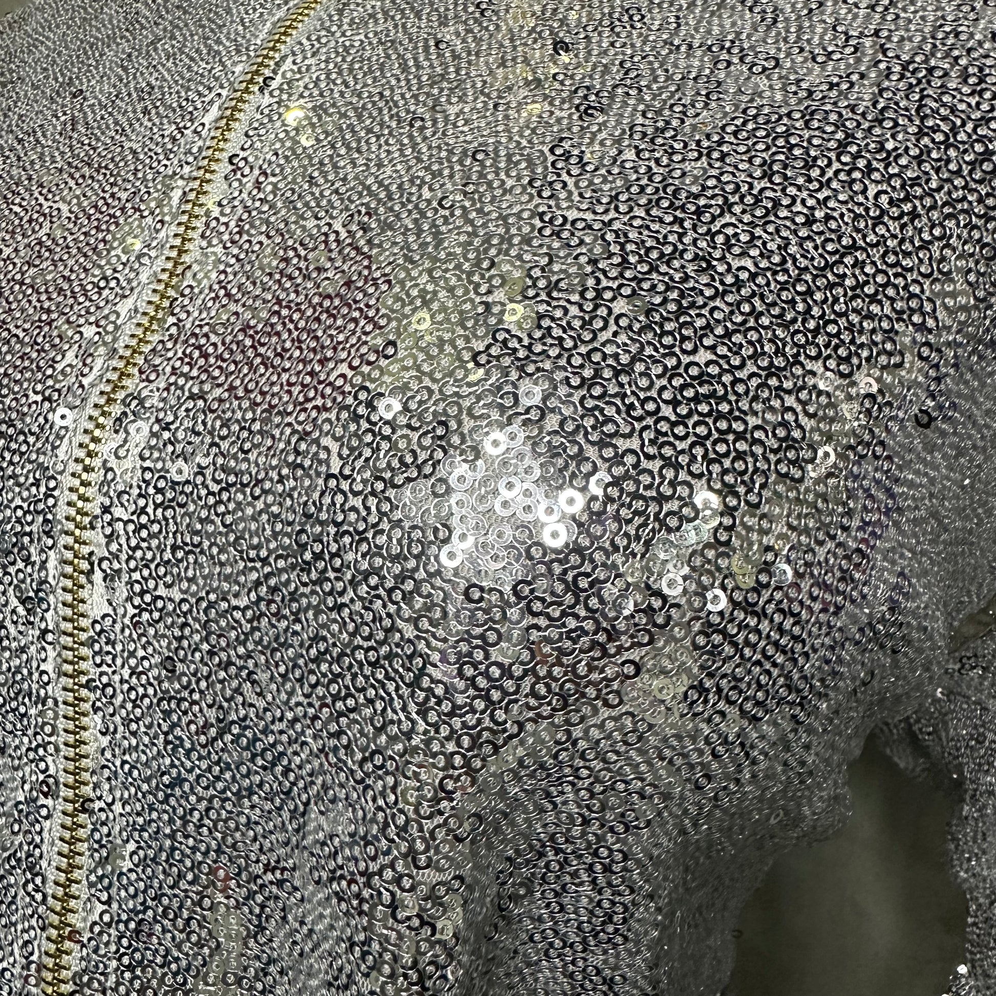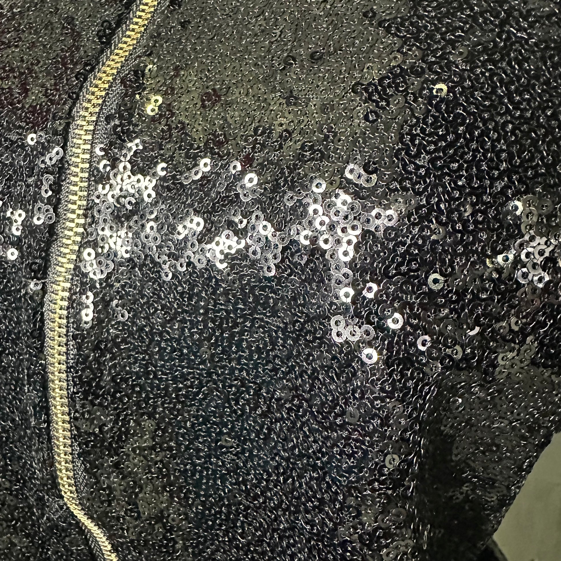 Luce espectacular con esta chaqueta bomber, diseñada para destacar en cualquier ocasión. Su exterior está completamente cubierto de lentejuelas brillantes que capturan la luz y agregan un toque de lujo a tu outfit.