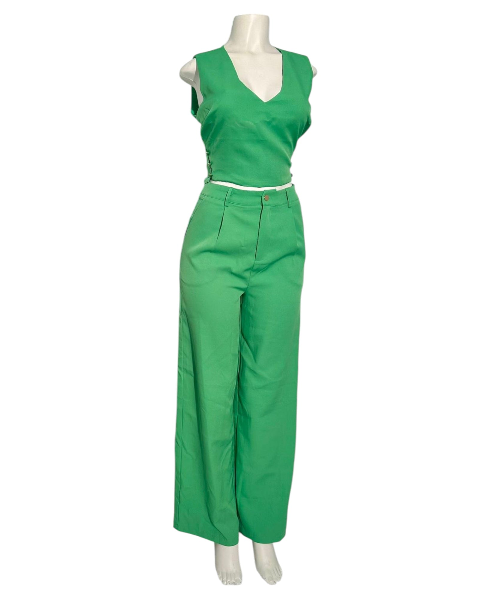 Este conjunto sofisticado en color verde vibrante es la elección perfecta para un look elegante y moderno. Ideal para eventos formales, citas o reuniones, este conjunto de dos piezas te hará destacar con estilo y comodidad.