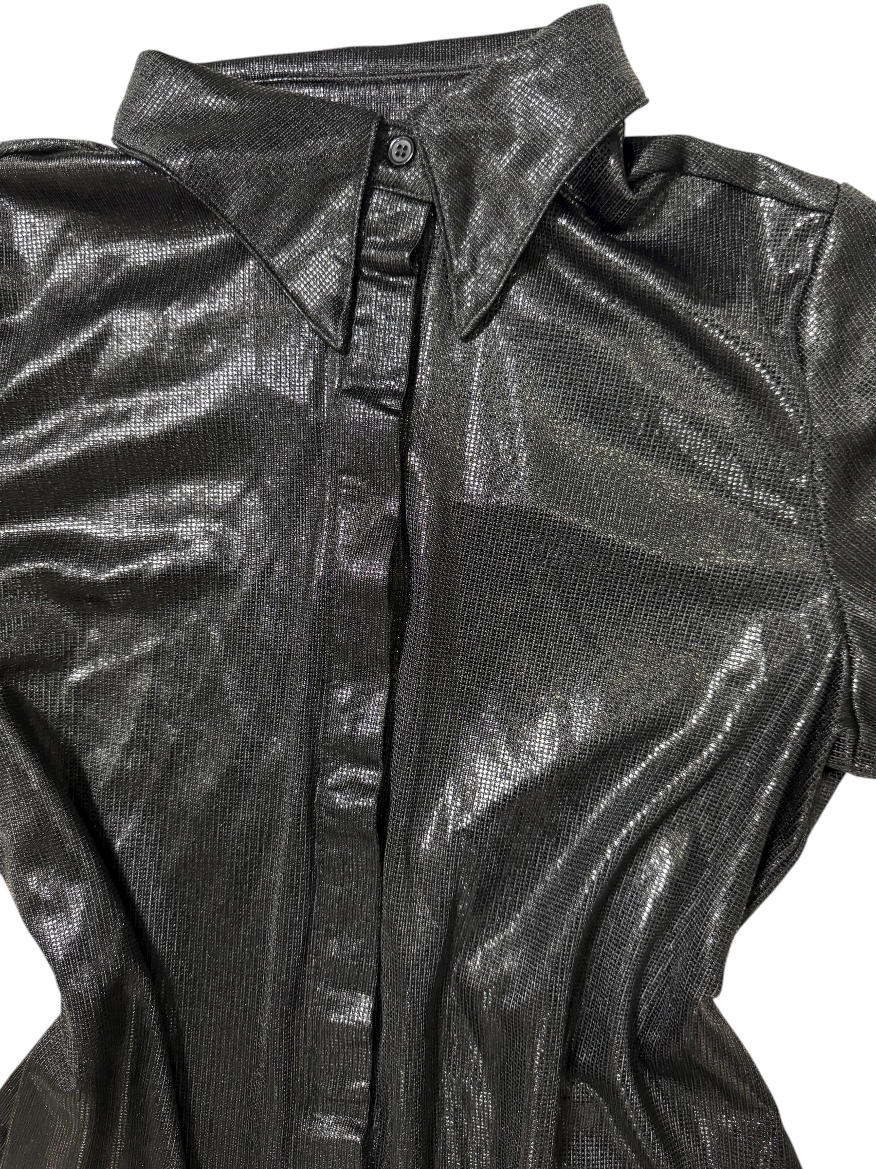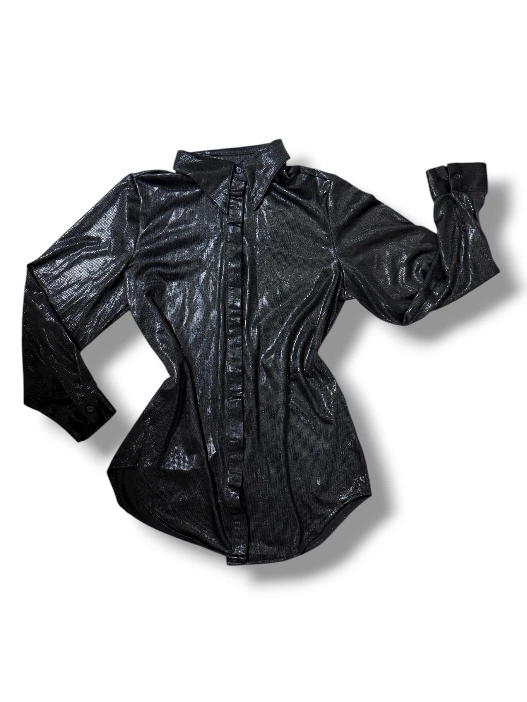 Esta camisa de manga larga en tejido brillante combina poliéster y spandex para ofrecer un ajuste cómodo y estilizado. Perfecta para un look nocturno o una ocasión especial, su acabado ligeramente brillante le da un toque de sofisticación que destacará en cualquier evento. Su diseño clásico con botones ocultos y cuello estructurado es fácil de combinar con diferentes prendas, permitiendo tanto un look elegante como uno más casual.
