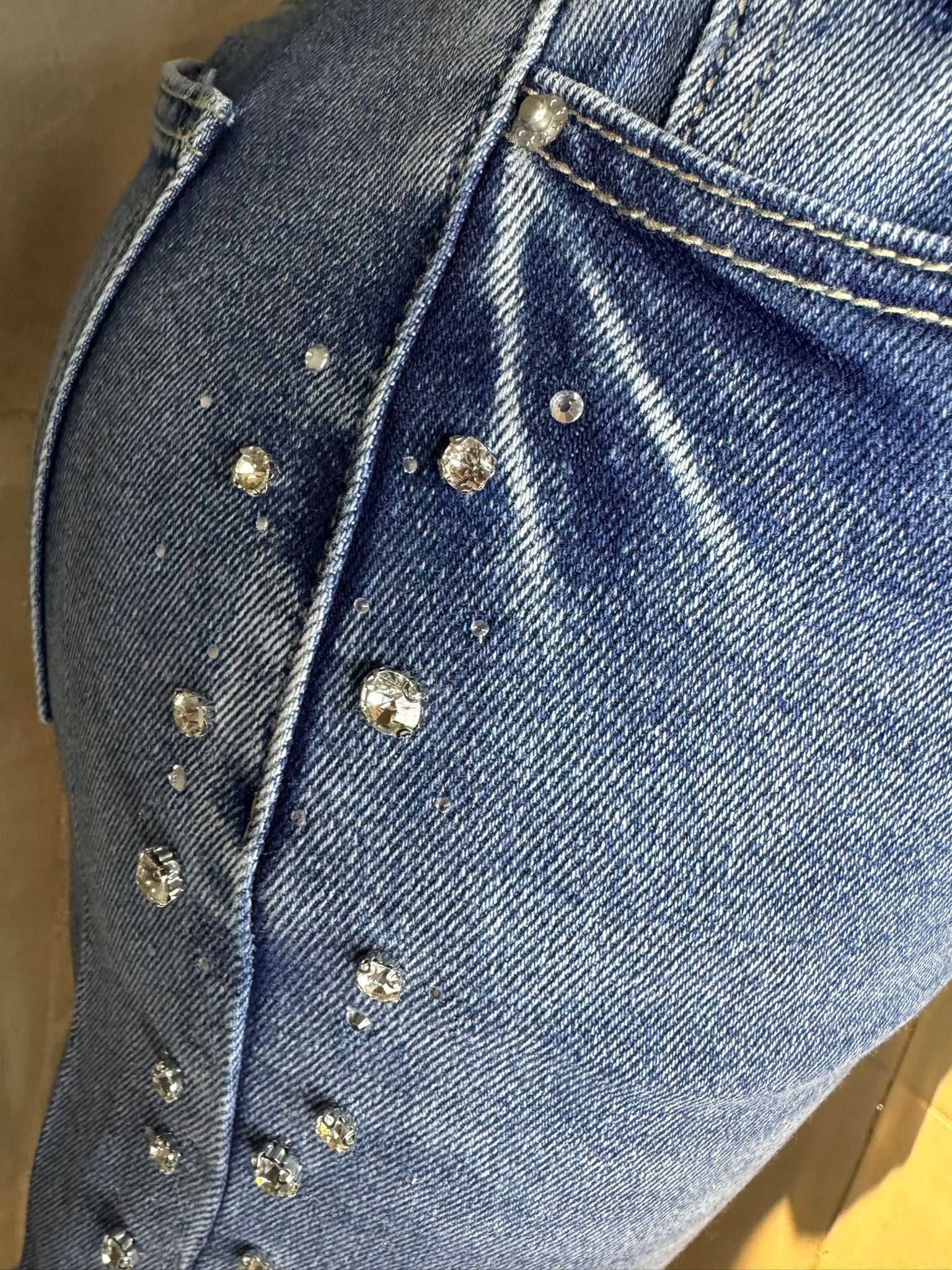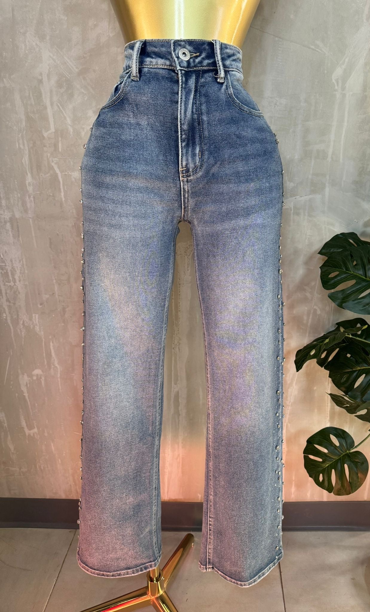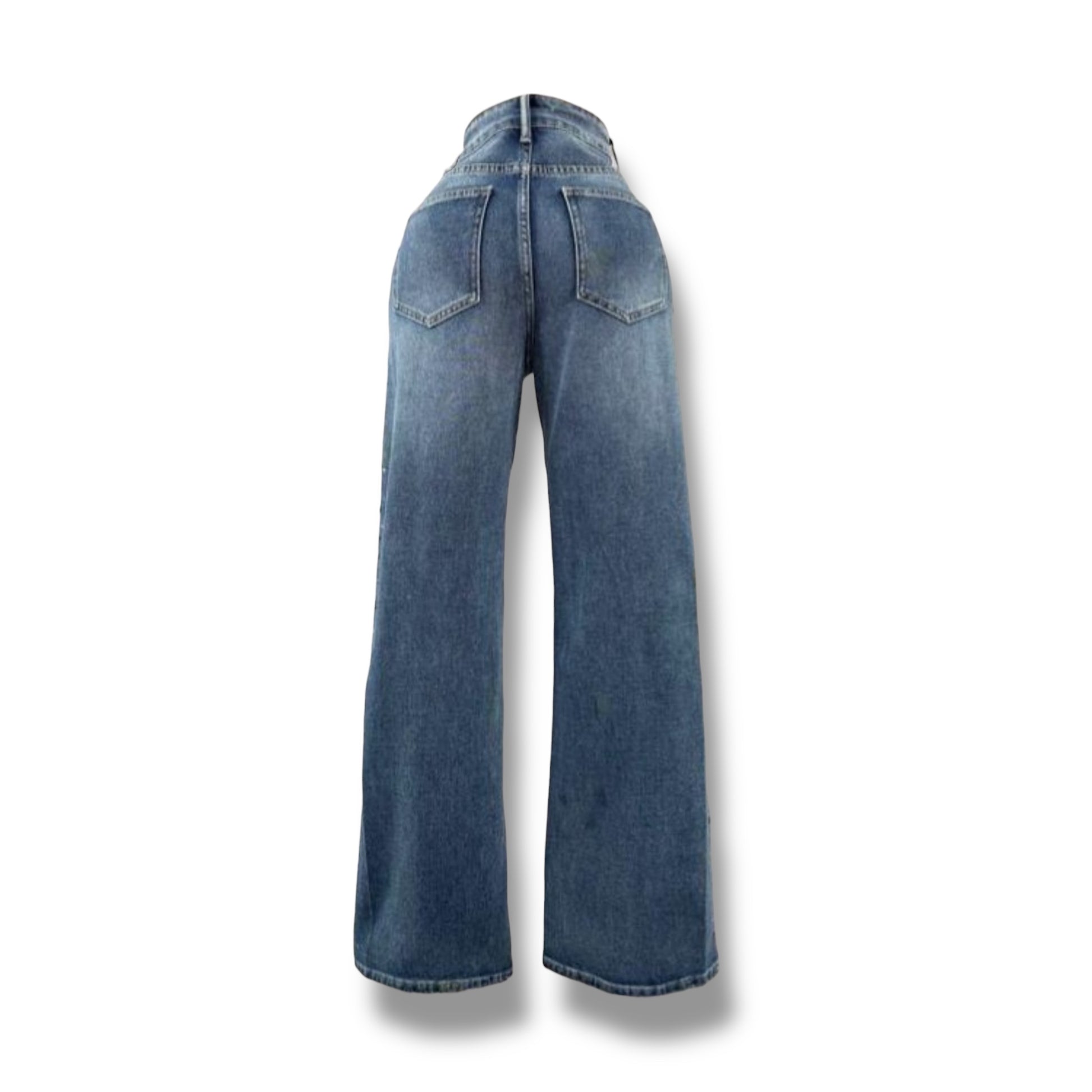 Este mahón wide leg de tiro alto redefine tu silueta con un corte moderno y estilizado. Incluye un delicado detalle de pedrería en la parte lateral que le añade un toque femenino y elegante sin perder la esencia casual del denim. Su tela es cómoda, resistente y con un ligero stretch que brinda un ajuste favorecedor. Perfecto para crear looks chic con tops, camisetas o blusas.