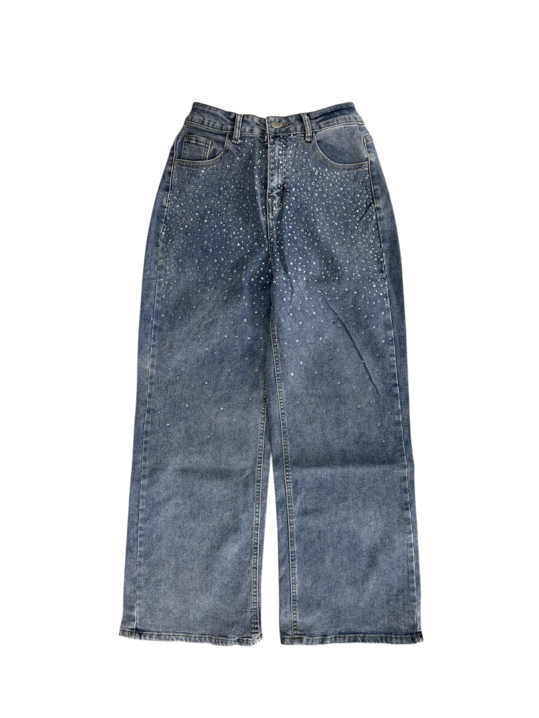 Este mahón wide leg en denim azul oscuro es la pieza perfecta para elevar cualquier outfit con un toque moderno y glam. Diseñado con brillos aplicados en degradado, ofrece un estilo llamativo pero elegante, ideal para noches casuales, salidas, eventos o darle chispa a tu look diario.