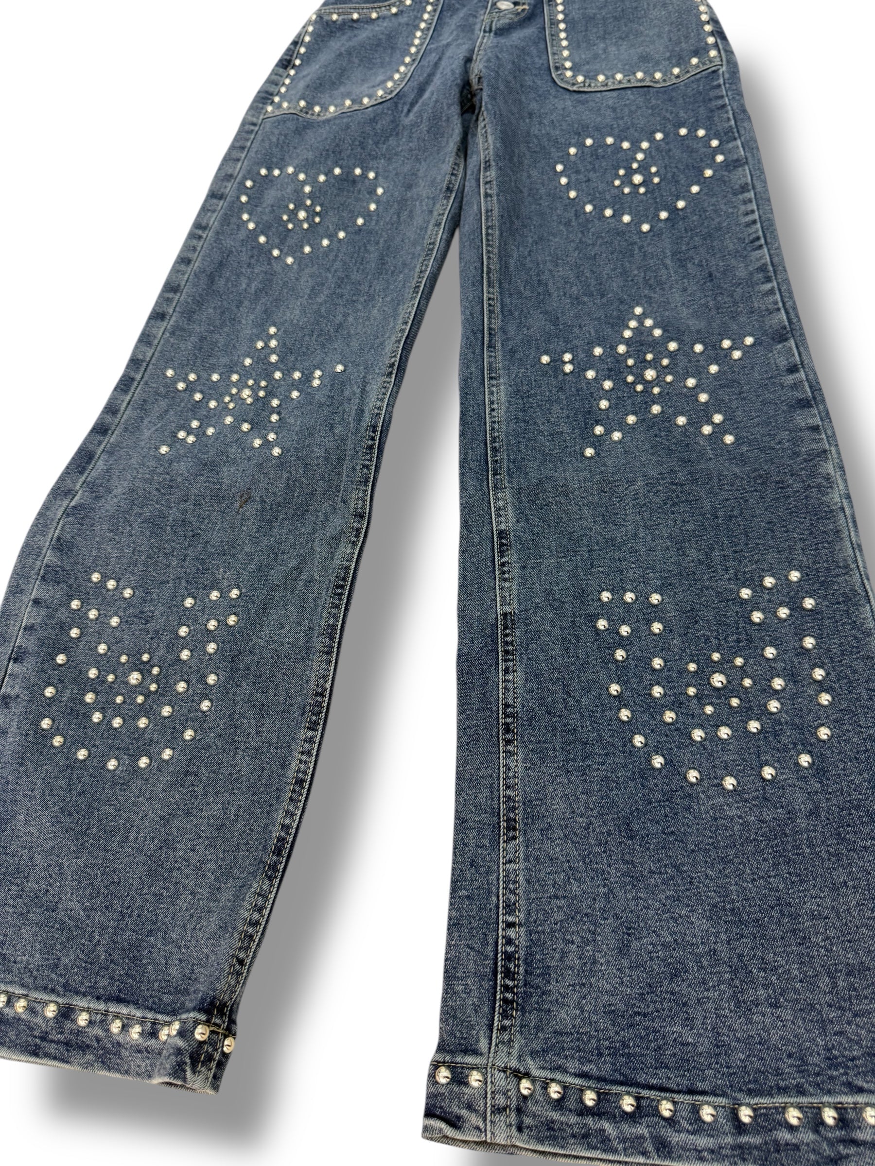 Dale un toque único a tu estilo con estos mahones de corte wide leg decorados con perlas brillantes en patrones de corazones, estrellas y herraduras. Un diseño moderno y atrevido que mezcla lo clásico del denim con el detalle chic de los apliques metálicos.