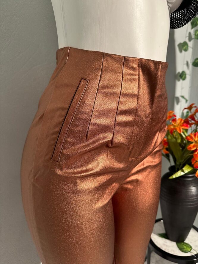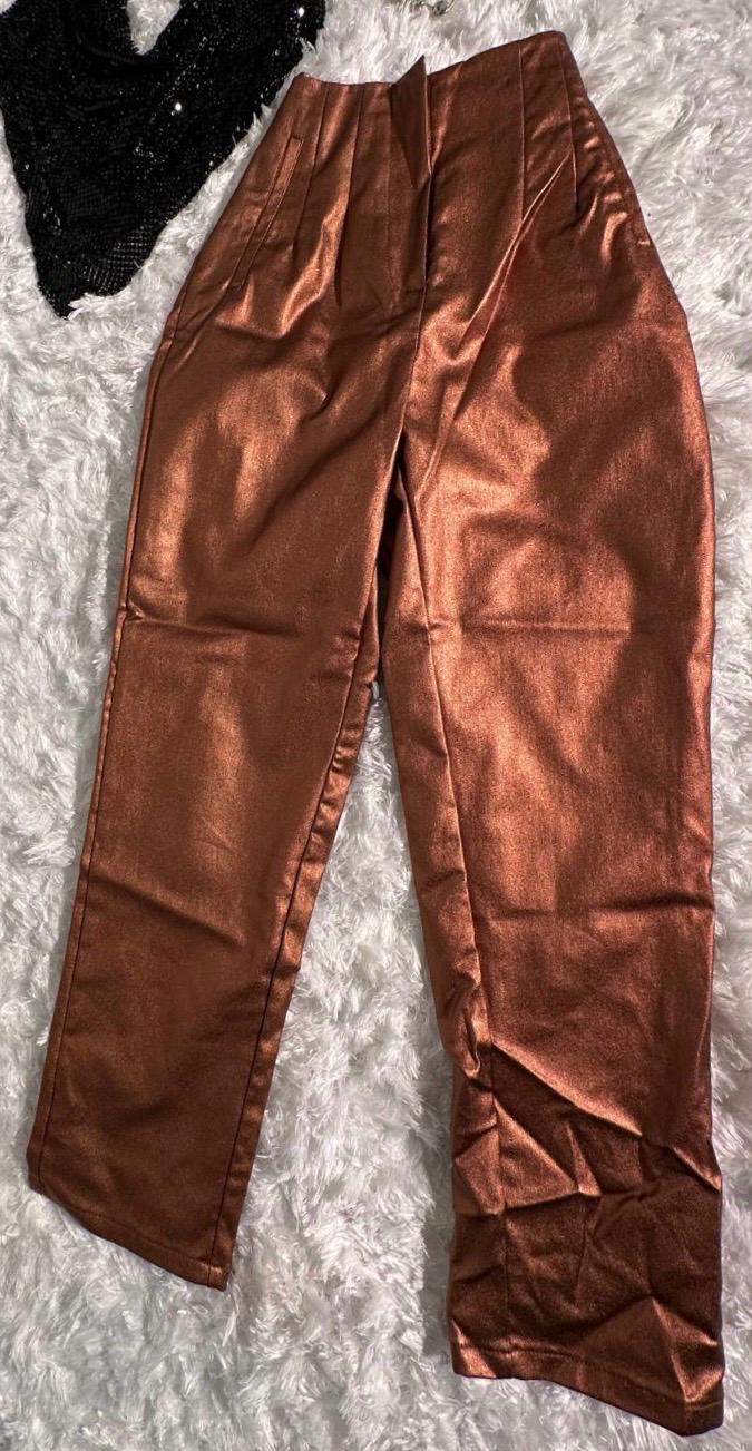Estos *Pantalones Metalizados en Color Bronce* son perfectos para quienes buscan destacar con un look atrevido y glamoroso. Confeccionados en un material brillante y suave, estos pantalones de corte alto y ajustado realzan tu figura mientras añaden un toque moderno a tu atuendo. Ideales para eventos especiales o para elevar tu look de noche, su diseño incluye bolsillos discretos y pinzas delanteras que estilizan aún más la silueta.