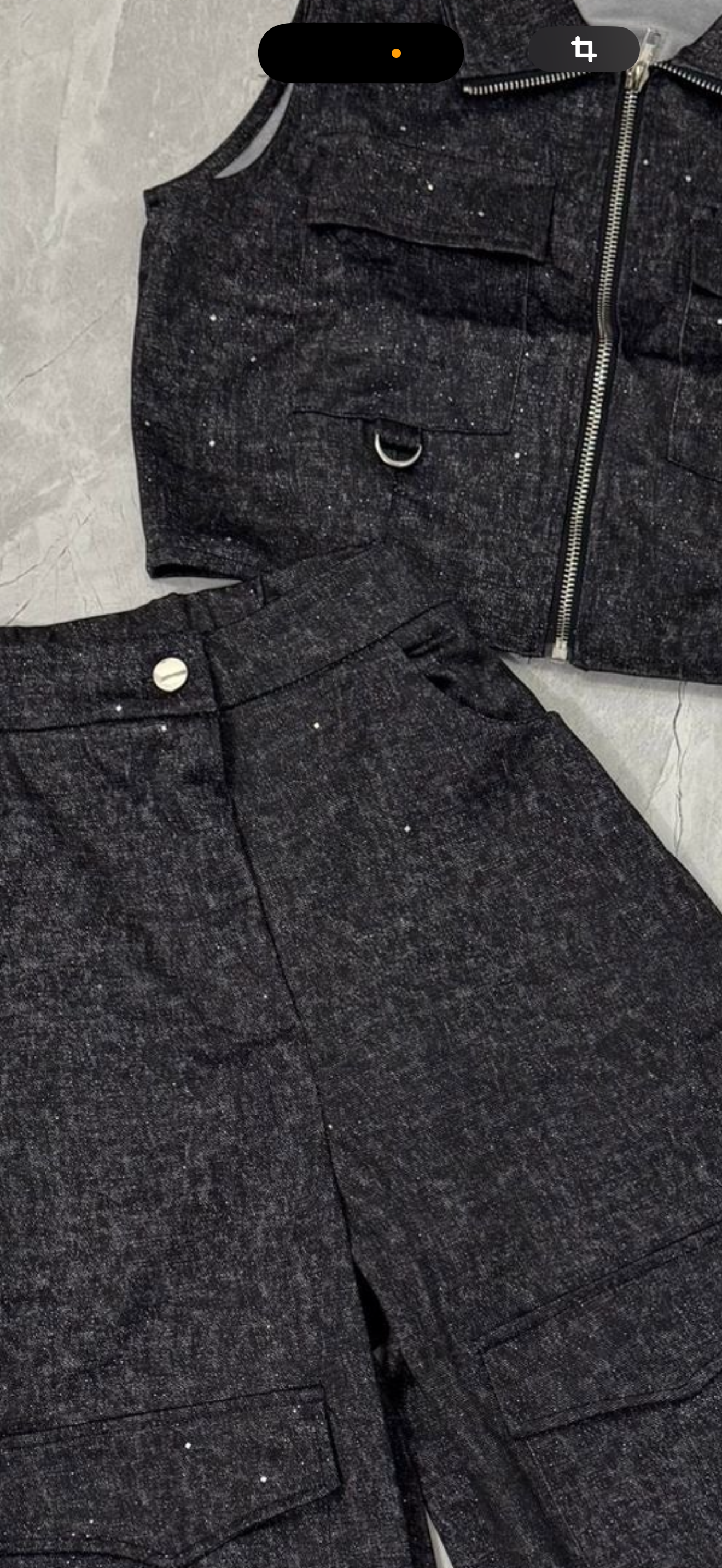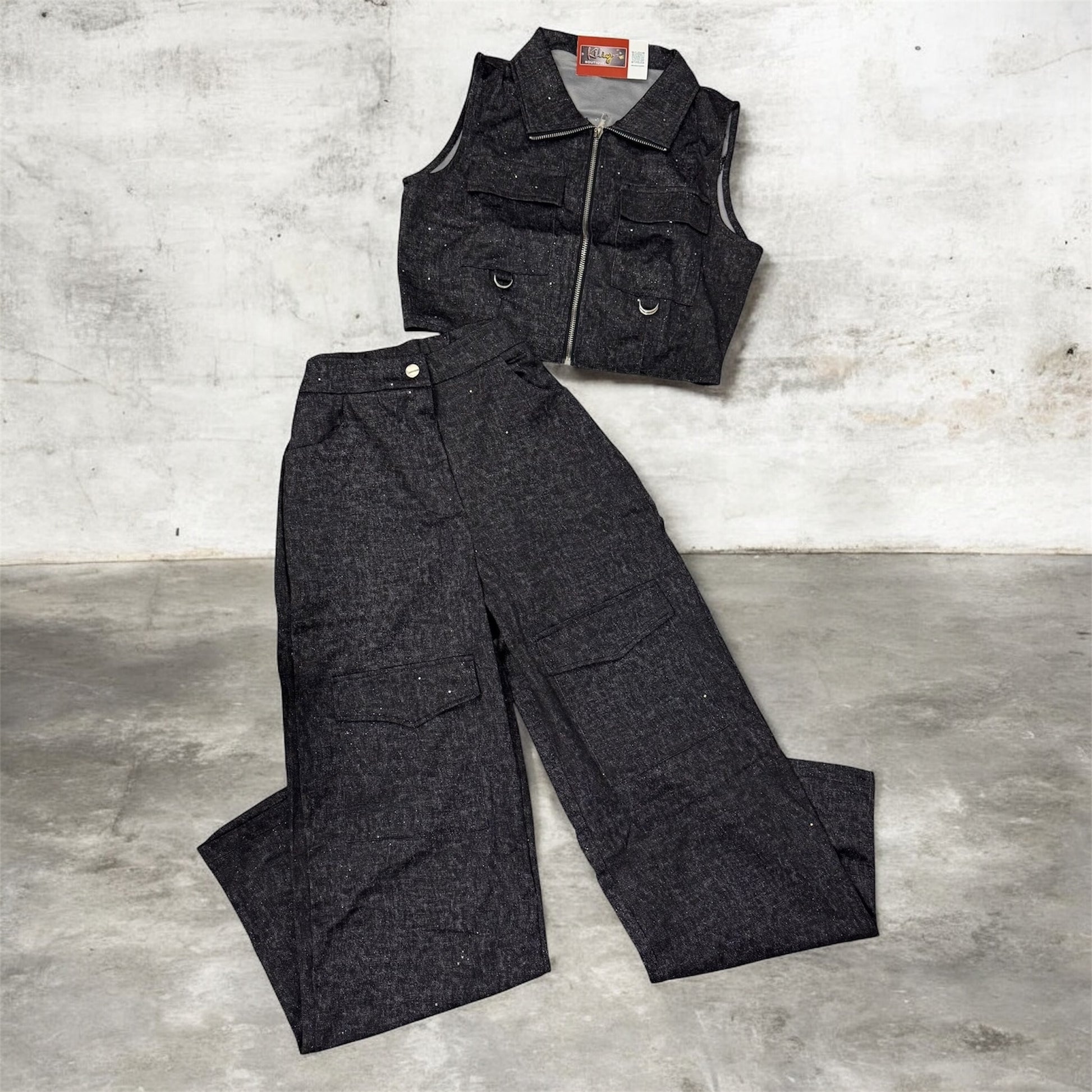 Luce un estilo moderno con este conjunto cargo en mahón oscuro. El set incluye un pantalón de pierna ancha con bolsillos funcionales y un chaleco sin mangas con cierre frontal de zipper y detalles brillantes sutiles que le añaden un toque sofisticado. Perfecto para destacar en cualquier ocasión casual o urbana.