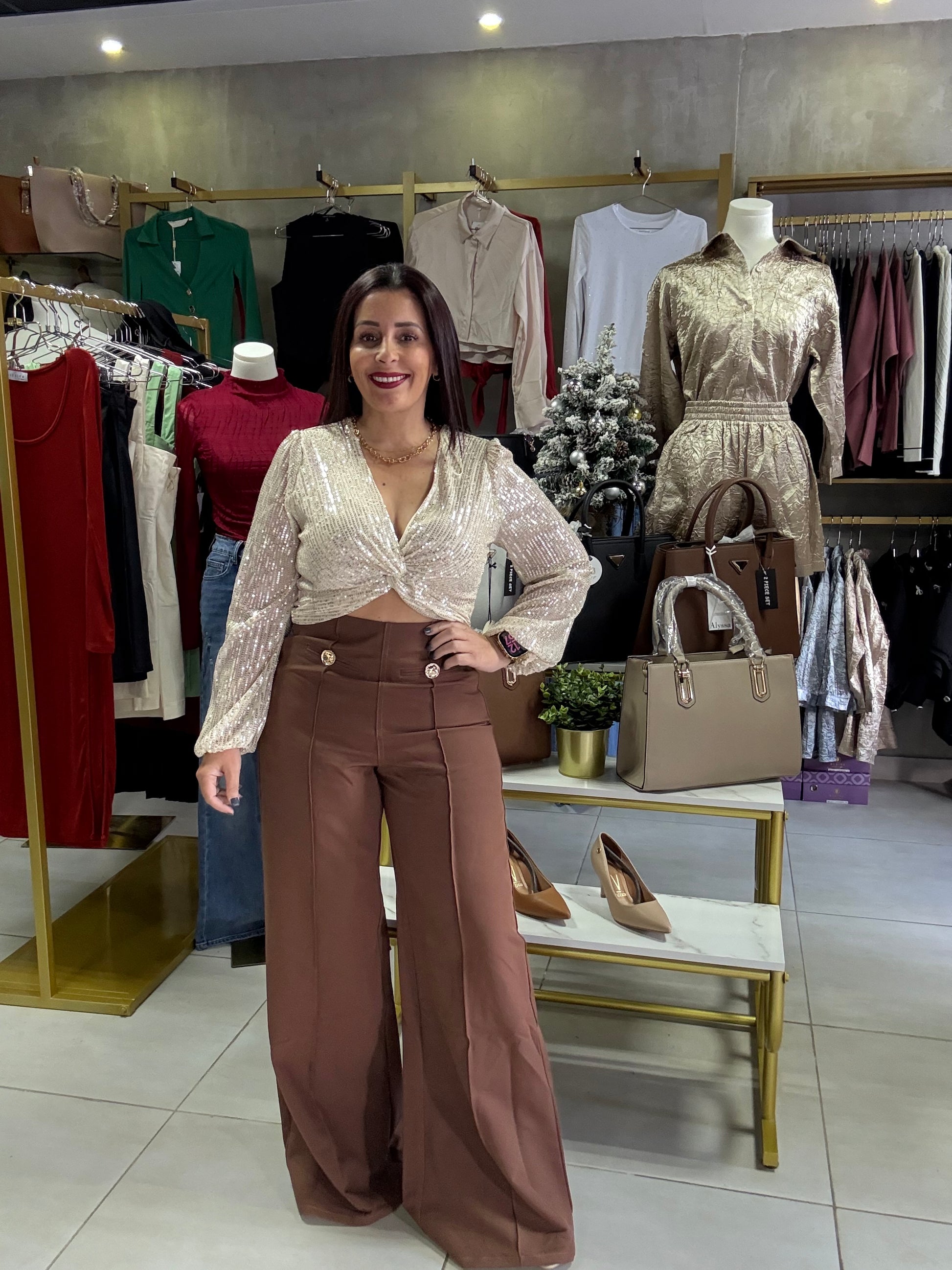 Pantalón Palazzo Chocolate “Luxury Fit” con Botones Dorados