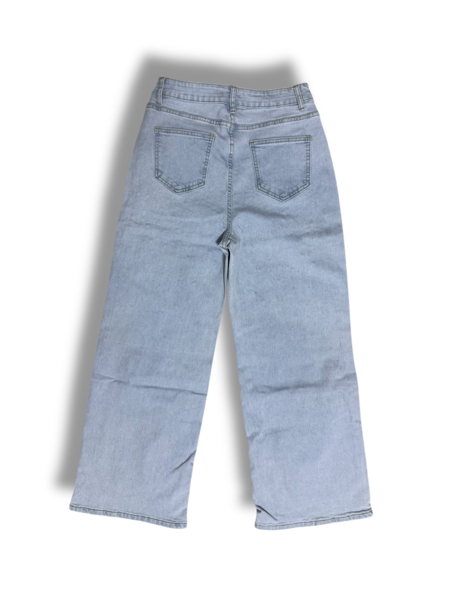 Eleva tu estilo con estos mahones wide leg en azul claro, diseñados para dar ese toque moderno y chic que tus outfits merecen. Su corte recto ancho estiliza la figura, mientras que los brillos aplicados al frente añaden un look glam que destaca sin exagerar.