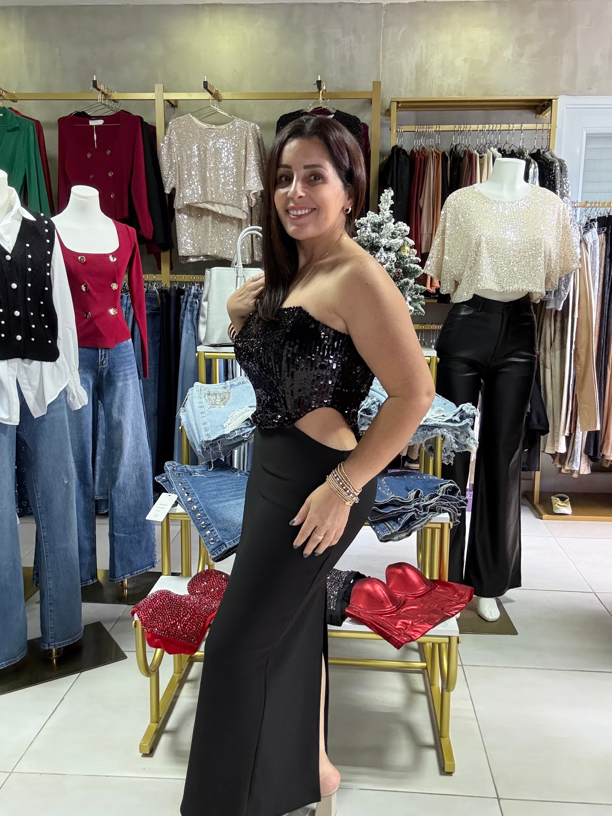 Este vestido strapless combina un top de lentejuelas que resalta la figura con una falda midi de corte recto que estiliza la silueta. Su diseño en color negro ofrece un look moderno, elegante y perfecto para eventos de noche. La espalda cuenta con un escote que añade un toque sofisticado y femenino. El material es suave, cómodo y con un ligero stretch que permite un ajuste favorecedor.