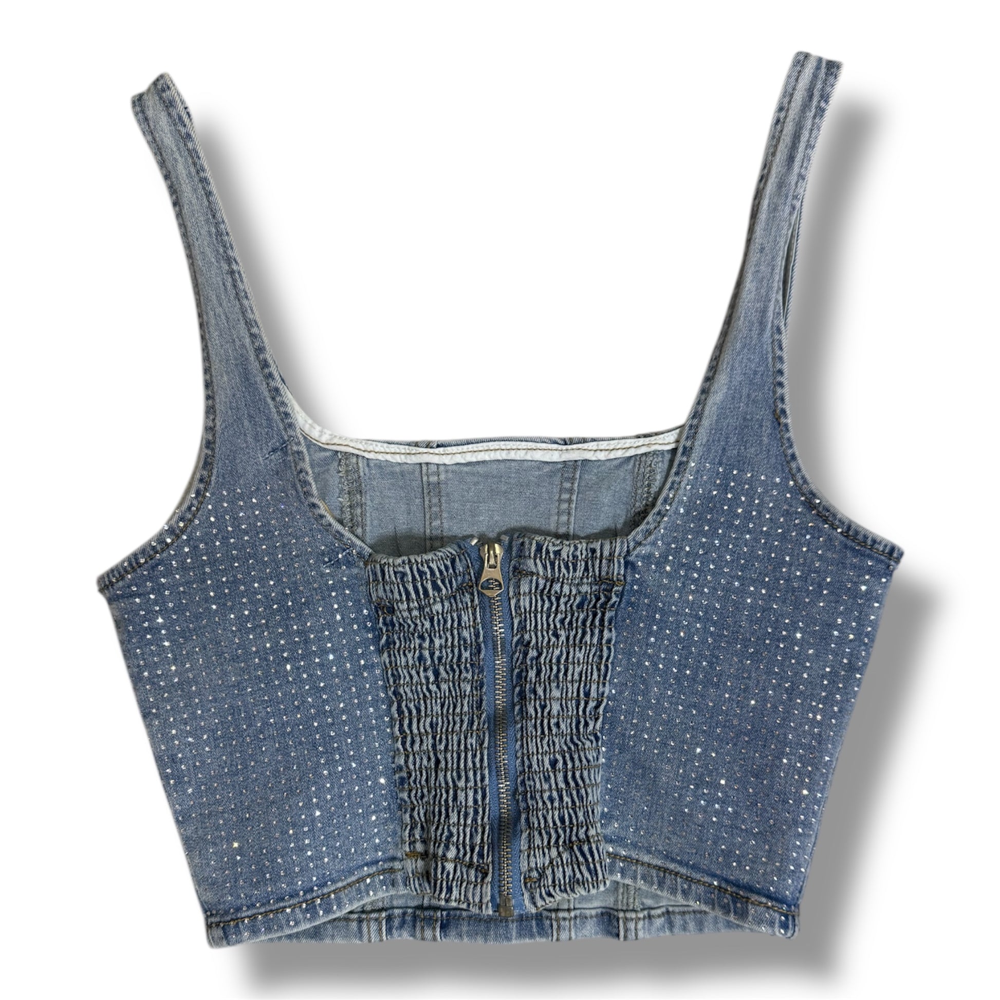 Este top de Mahón es perfecto para realzar cualquier look casual o sofisticado. Decorado con pequeños detalles brillantes, su diseño combina la robustez del denim con un toque moderno y chic. Con un cierre trasero elástico y ajustable, ofrece comodidad y estilo en partes iguales. Ideal para combinar con faldas, shorts o pantalones.